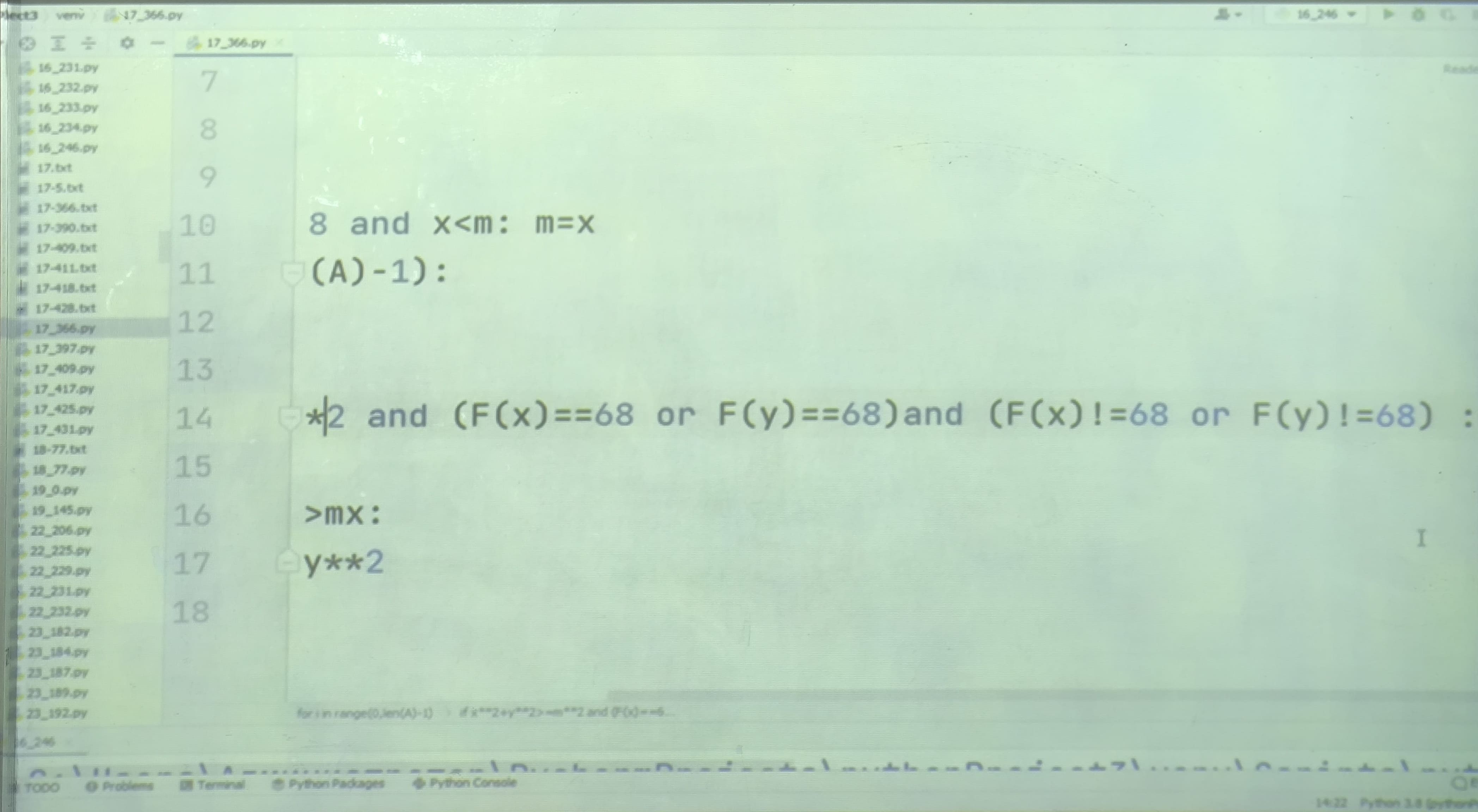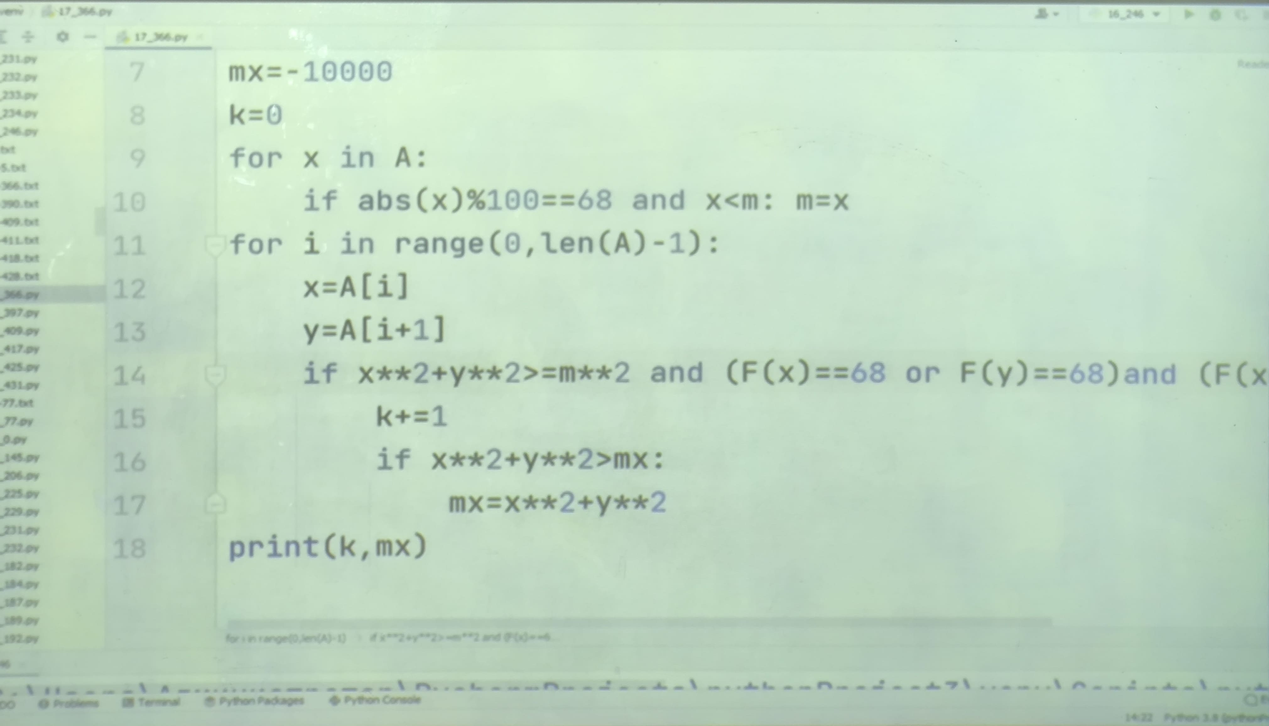 366) (PRO100 ЕГЭ) В файле 17-366.txt содержится последовательность целых чисел, по модулю не превышающих 10000. Определите количество пар элементов последовательности, в которых ровно одно из двух чисел оканчивается на 68, а сумма квадратов элементов пары не меньше квадрата минимального элемента последовательности, оканчивающегося на 68.